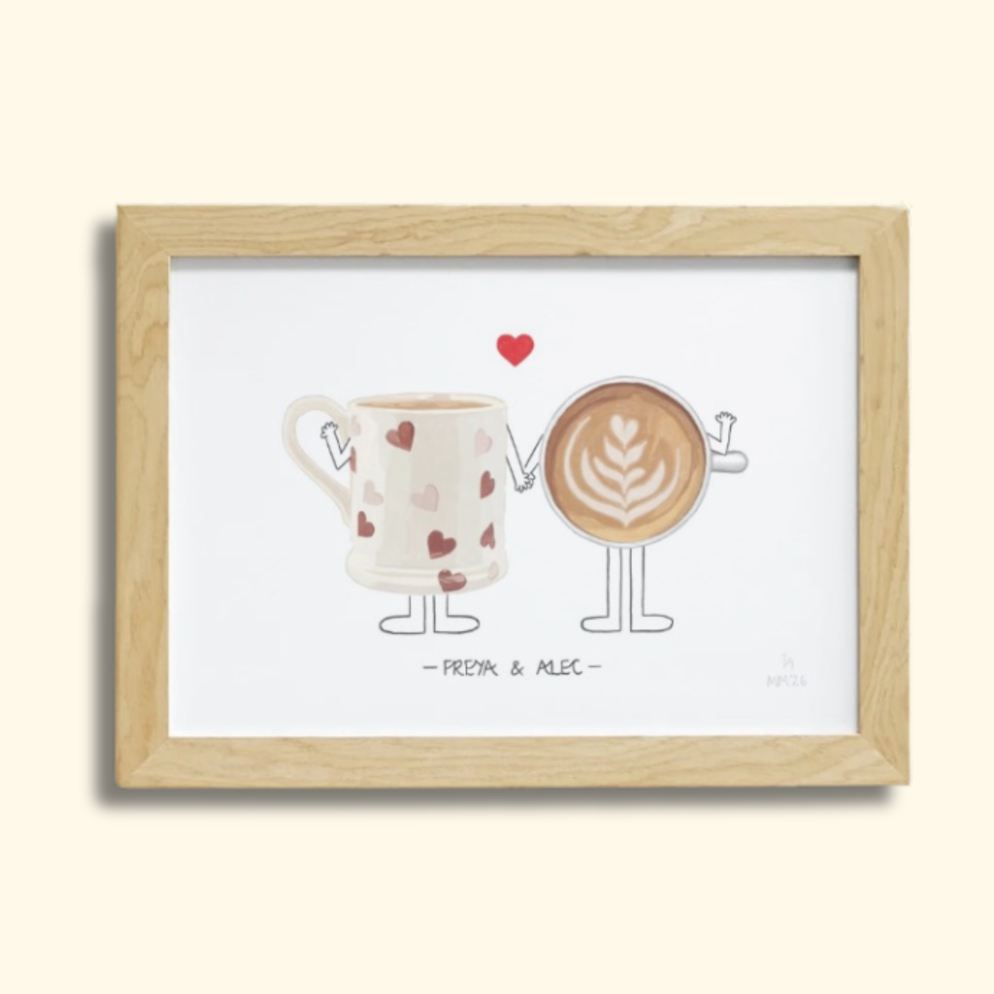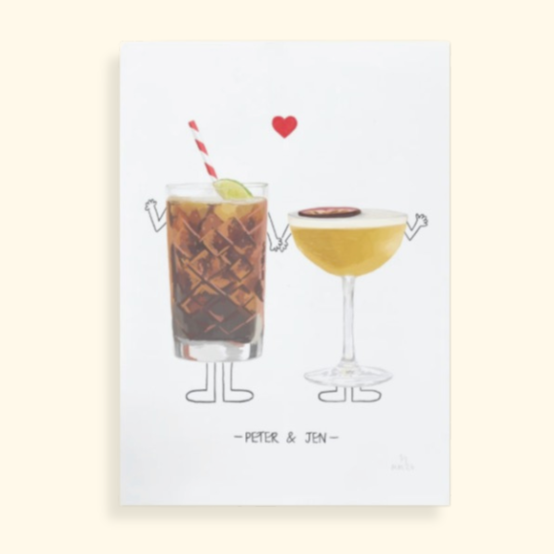 A personalised illustration of people as their favourite drinks with a red heart chosen from Maisie’s Drinks Menu. The perfect thoughtful gift for Valentine's Day!