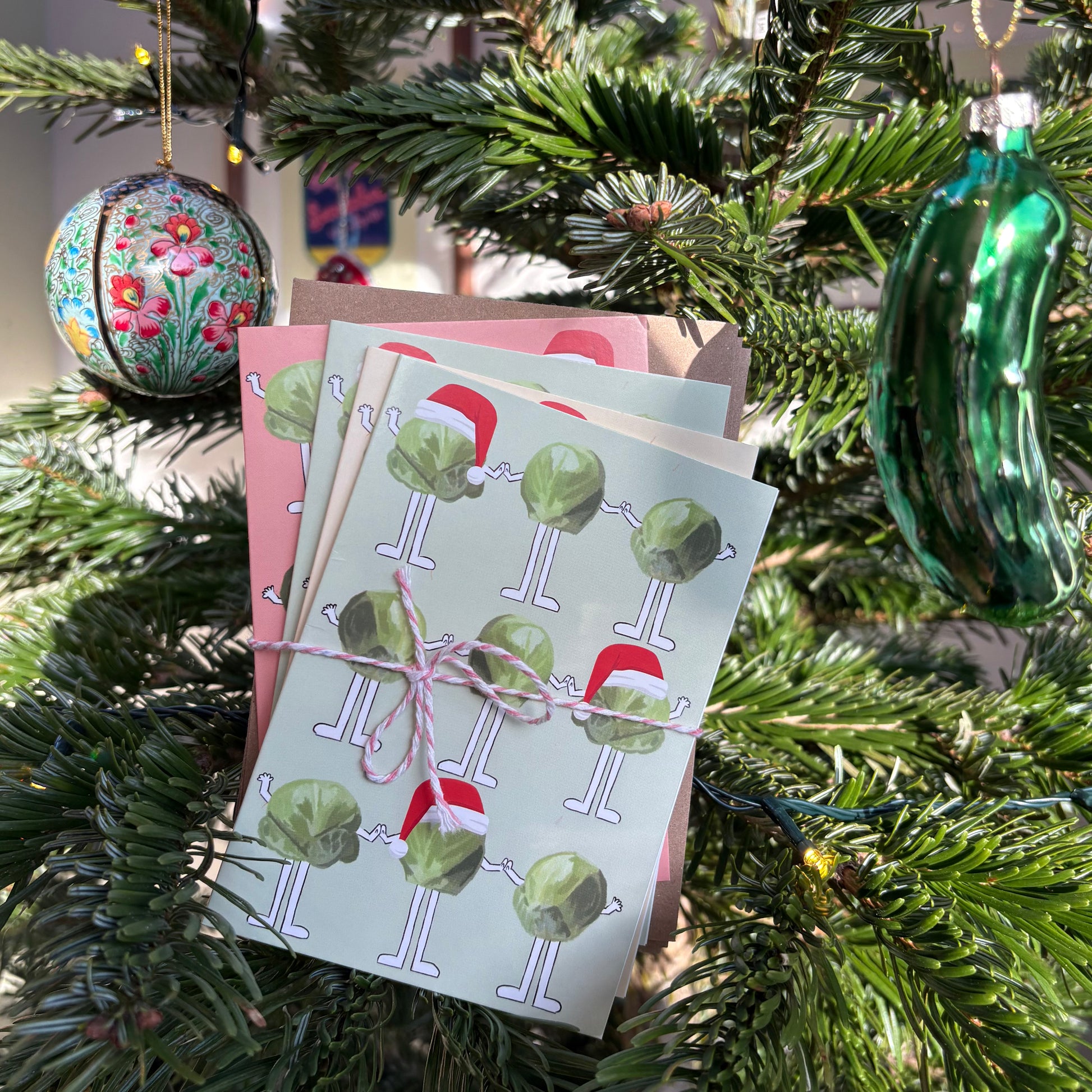 A firm, festive feast favourite, brussel sprouts with Santa hats. Featuring Maisie's Munch signature arms and legs paired with nine hand-illustrated sprouts on four A6 cards, accompanied by four kraft envelopes. The perfect Christmas cards for the whole family or extra special friends.